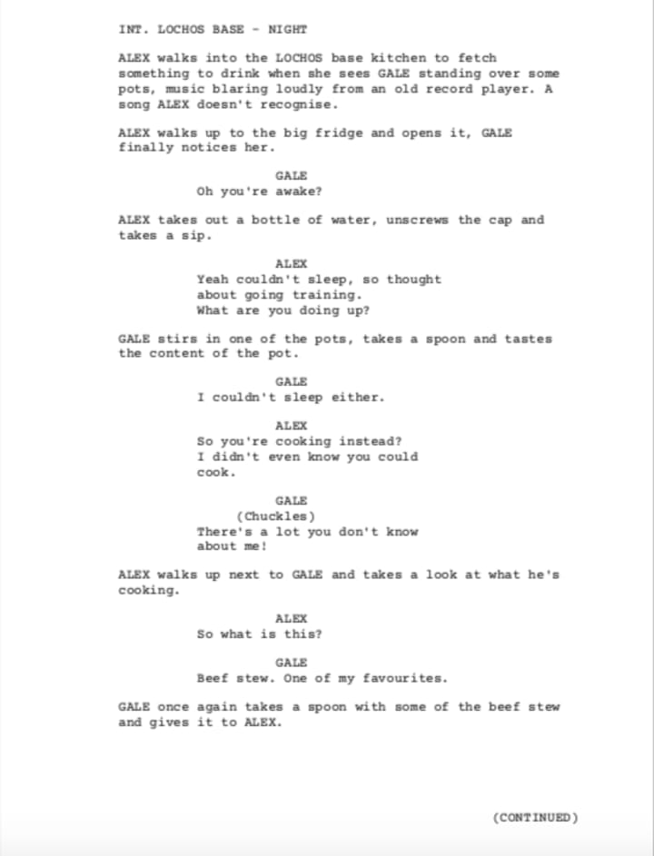 INT. stands for "Internal", so inside. Outside is EXT. which stands for "External." This is the first thing you write, and after that is the location, so in my example, it's a base. Lastly is "DAY" or "NIGHT." (Don't write things like "MIDDAY," "EARLY MORNING" or things like that, as you would do this in the scene description, not in the scene header.)
