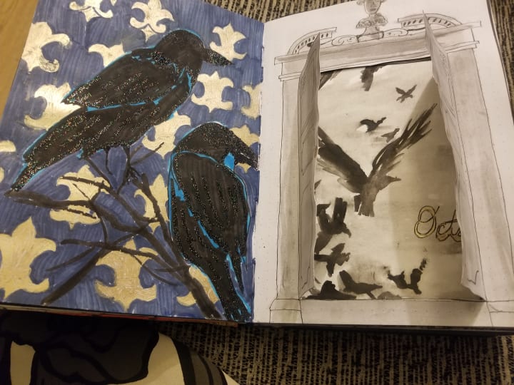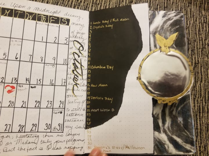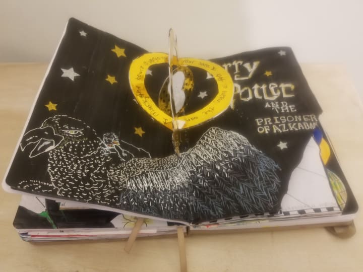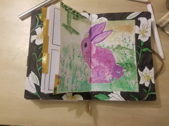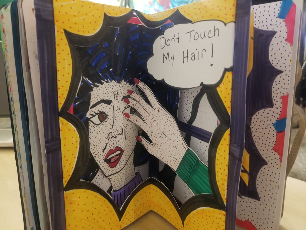 My 2021 Bullet Journal set up included a pop-up taught by another YouTube content creator with my own personal creative spin, a Swimming mermaid, a reflection of my recent exploration of black folklore. In January I would explore my passion for textiles creating a spread inspired by Otomi embroidery from Mexico. February, my love of musicals with a Secret Garden theme where I intricately cut out pages of my journal to create a beautiful garden gate over run with foliage. In March a “Don’t Touch My Hair” Pop-Art inspired theme exploring with humor the experiences of black women with natural hair. April featured Lillies and Bunnies evoking memories of Easter at home with my family. I would continue to experiment with concepts cutting and slicing my journal to create books within books. May’s spread would become my most ambitious to date. A Harry Potter themed spread with a pop-up time turner that spins and a moving picture frame. I spent days sketching and cutting and working and reworking trying to figure out how to create this thing I saw in my mind. And I did!