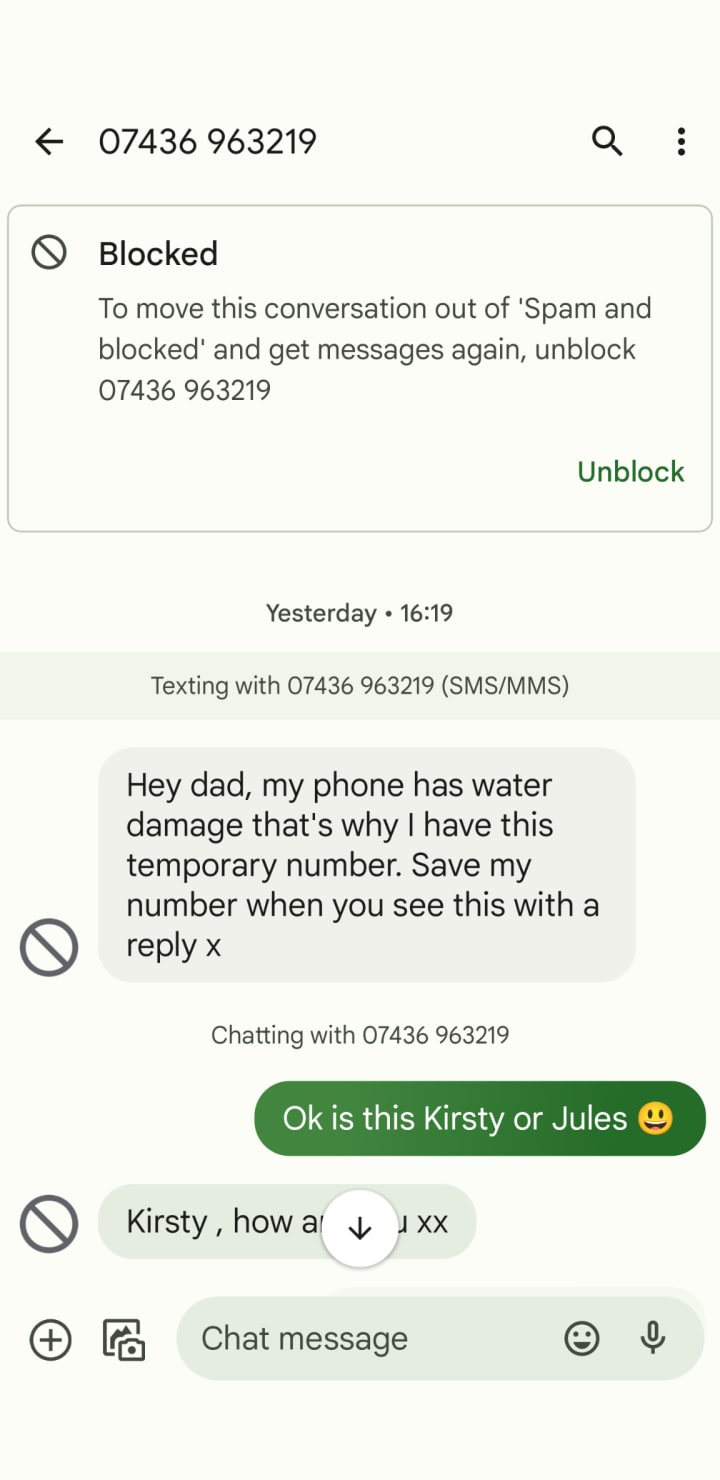 I got a text saying from my “child” telling me her phone had water damage so could I use this temporary number that she had texted me from. Now my daughters are both tech-savvy and have backup devices and would be unlikely to send me this sort of text.