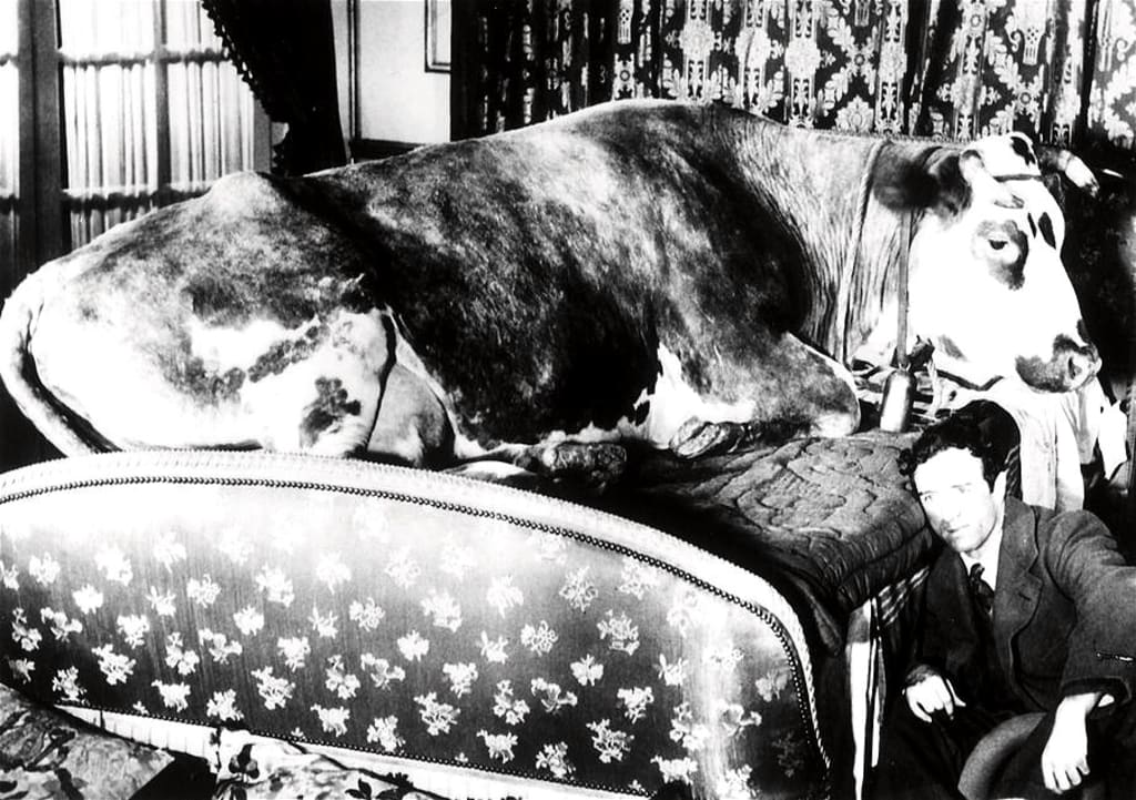 The weighted solemnity of communication gives way to a ribald surrealism that stains the barren landscape of the mind with lurid flashes of absurdity. A cow rests atop a bed — the sacred cow, of course, domesticated and desecrated, a silent witness to the farce. In this deranged domestic scene, the bed is no longer a place of rest or union but an altar of absurdity, where love and passion are punctuated by interruption, by regret, by the sour aftertaste of thwarted consummation.