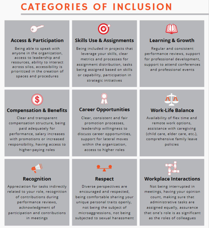 Aleria offers 9 Categories of Inclusion that present an excellent basis for a survey on workplace inclusivity: