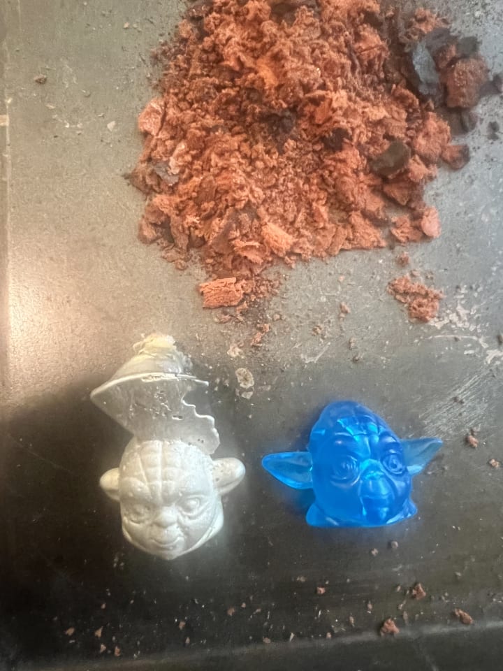 But… I am excited to show you my results. This time I managed to melt the silver and get it to pour down into the mould. Dear Yoda (“try you must and the Force is with you!” lost his ear tips and now looks like Shrek.