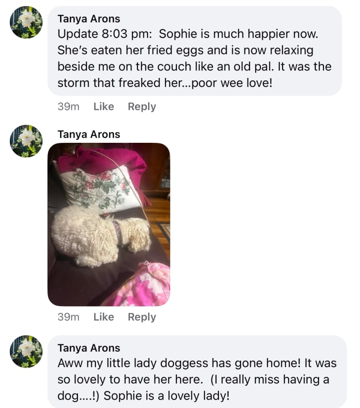 This evening, just on dusk, with an impending thunderstorm, I heard knocking at my door. A man I have vaguely seen before with my neighbour’s dog Sophie in his arms. She had escaped. (Probably afraid of the storm!)