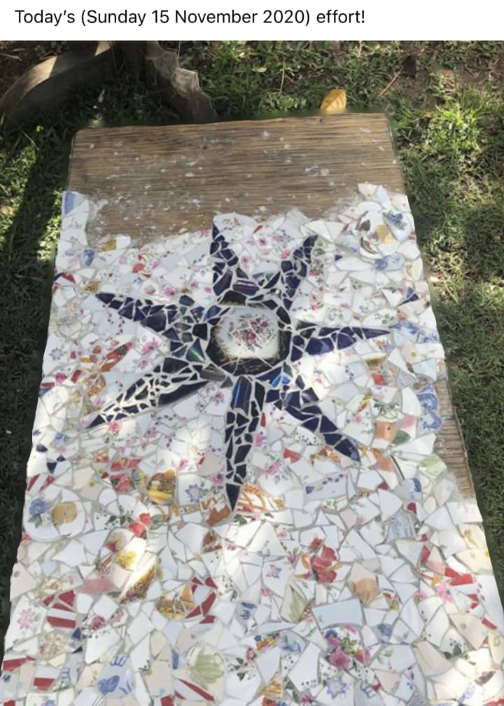 Not much left to glue on...but I must admit I am rather exhausted. I need to push through, keep gluing then need to grout it and seal it then varnish the legs etc.