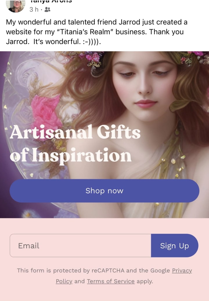 I wish to thank Jarrod Nielsen for his hard work wrangling the IT side of things in getting my new Titania’s realm website live on Facebook, Instagram and Square Up. Two full days and nights of wrangling to achieve this especially made frustrating because The Tanya is not much help when it comes to computer problems. At one stage I even had trouble with my own passwords and email.