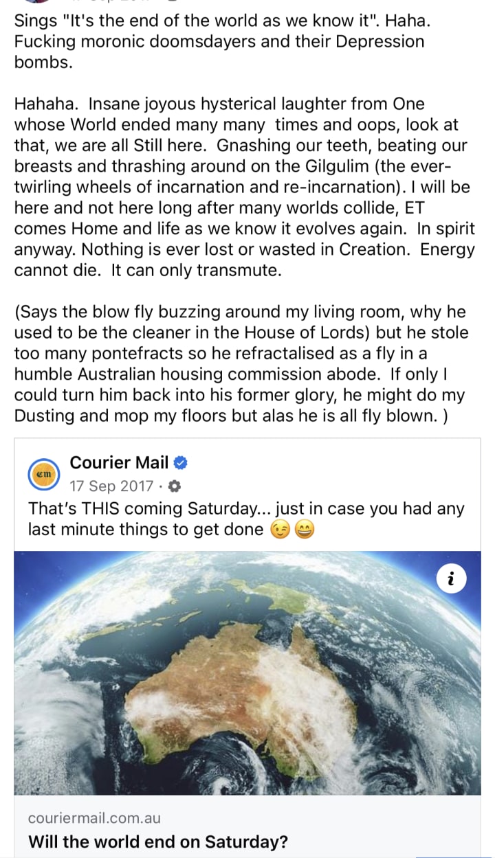 It’s not Death I fear as death is merely a shedding of one form and a transition to another form or dimensionality. But my body has its own consciousness and every time I have been close to Death itself it has chosen, often at the 11th hour to come back for some more hobbitty jiggling along on roads to nowhere and more epic fucking emotional torture.