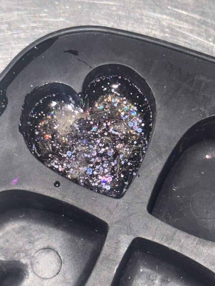 This evening I plaited the piece of Beauregard’s tail I had kept in my mother’s locket. I have set it in resin with some purple and pink glitter in a heart-shaped ice cube tray (I use for resin!). I hope it turns out well as the resin is quite old, left over from when I renovated Gisela’s marble table back on 21 October 2020.