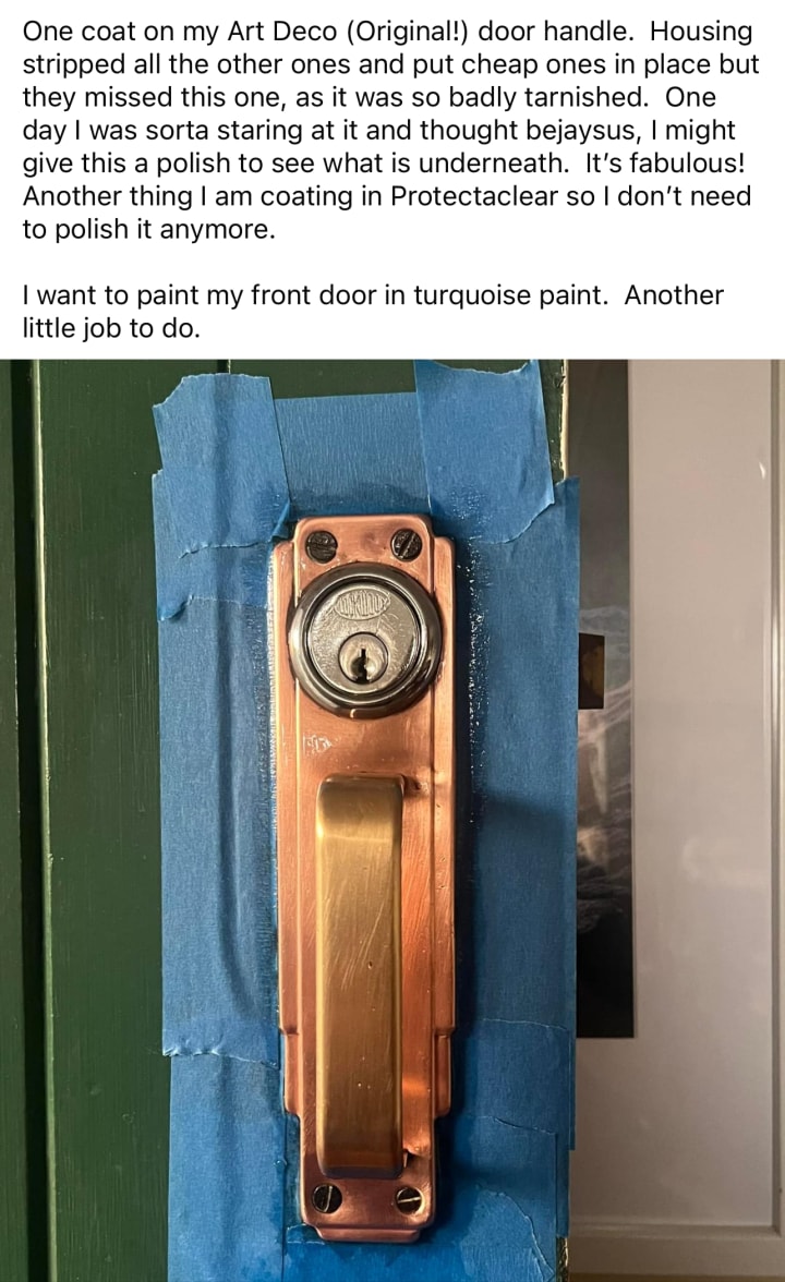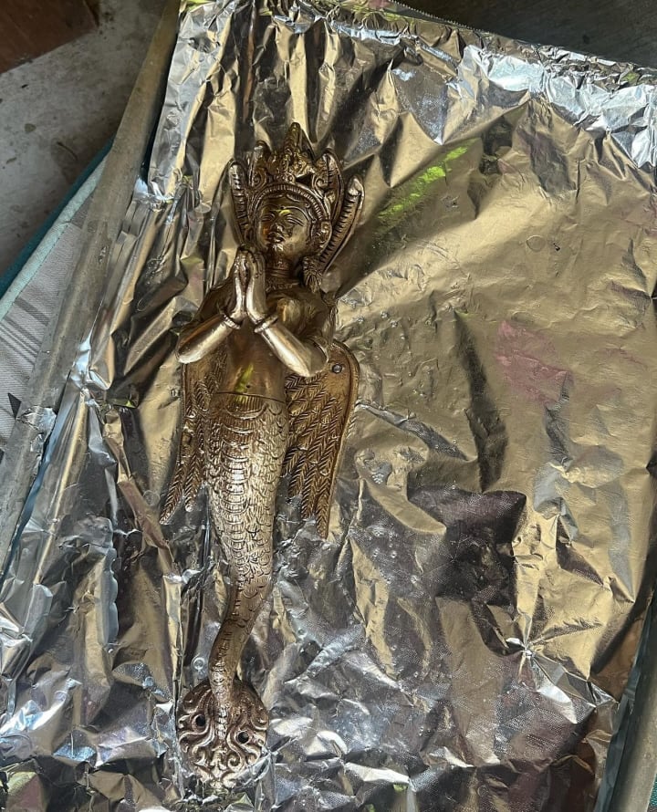 Second coat of Protectaclear on my brass Naga Kanye (guardian of the Underworld in the Hindu religion) Half-Angel/half-mermaid. She guards my front door but I grew tired of having to constantly polish her so she is receiving a protective coating. I still have the two smaller Naga Kanyes that guard my front bedposts to do. :-)