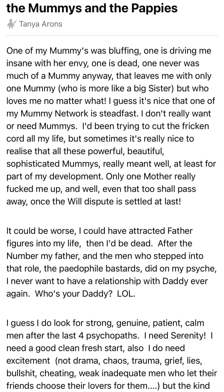I write about my life experiences. I write about complex ptsd, the agonies, the angst and my post traumatic growth. About Beauty, Truth and Honour and little vignettes of comfort from the spirits that love me: living and dead. I also Dance!