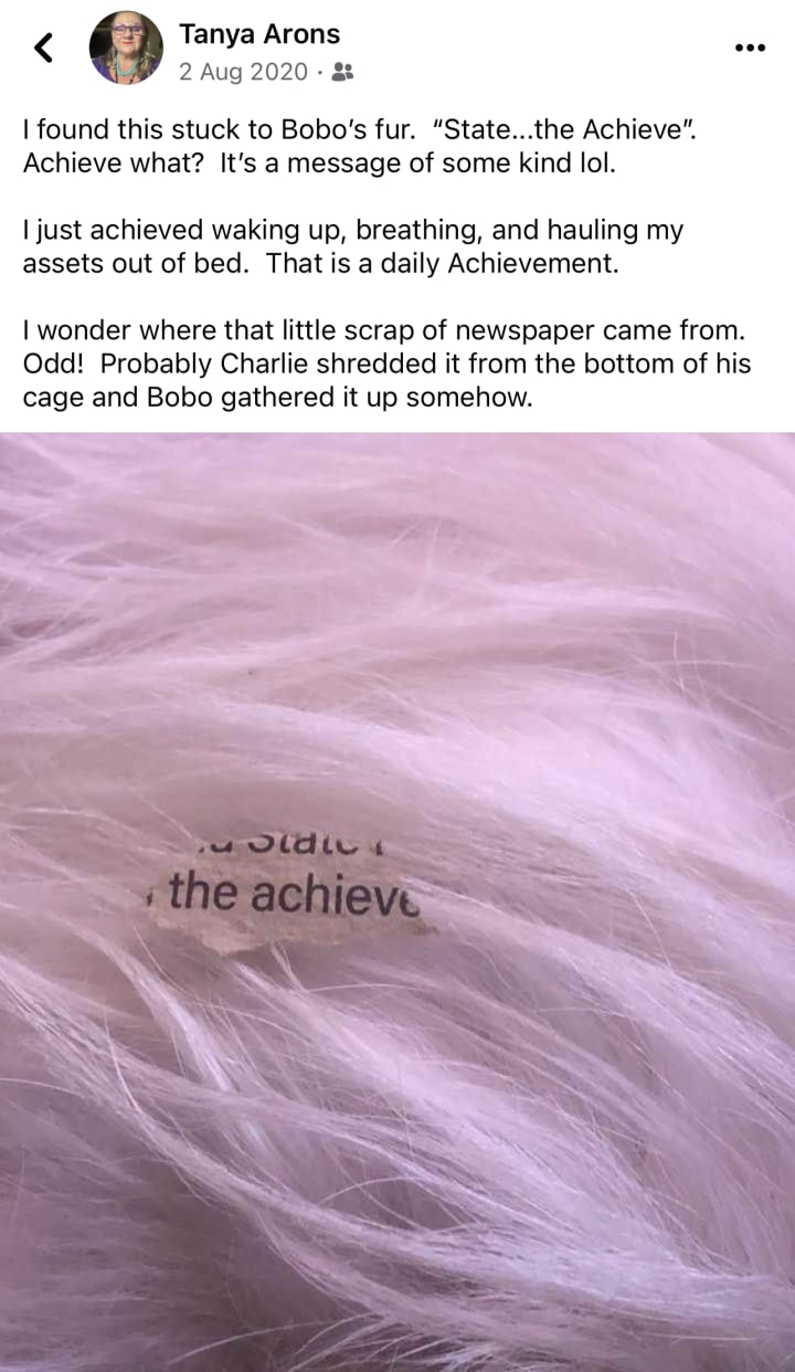 Every day without you and Charlie, without real solid love that is pure and unconditional and unceasing…has been a torture and an agony. But the gods gifted me another Beau in the form of a feisty little cockatiel and little Kermie so they are bringing you back to me as refracted soul lights of immense proportions.