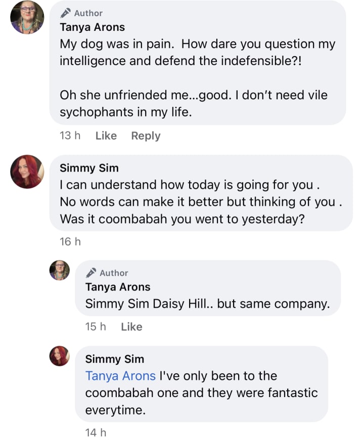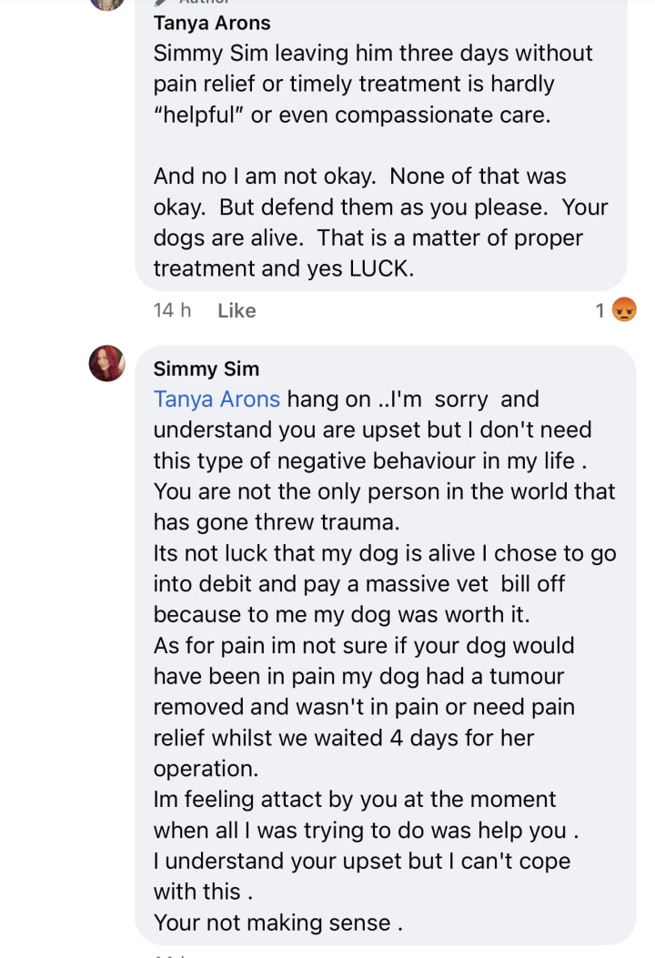 The fact I doubted my own intuition that something was terribly wrong, (in a trauma state) and did not go to be with my dog earlier (ceding to their negligence and bullying tactics) is something I will have to live with for the rest of my life.