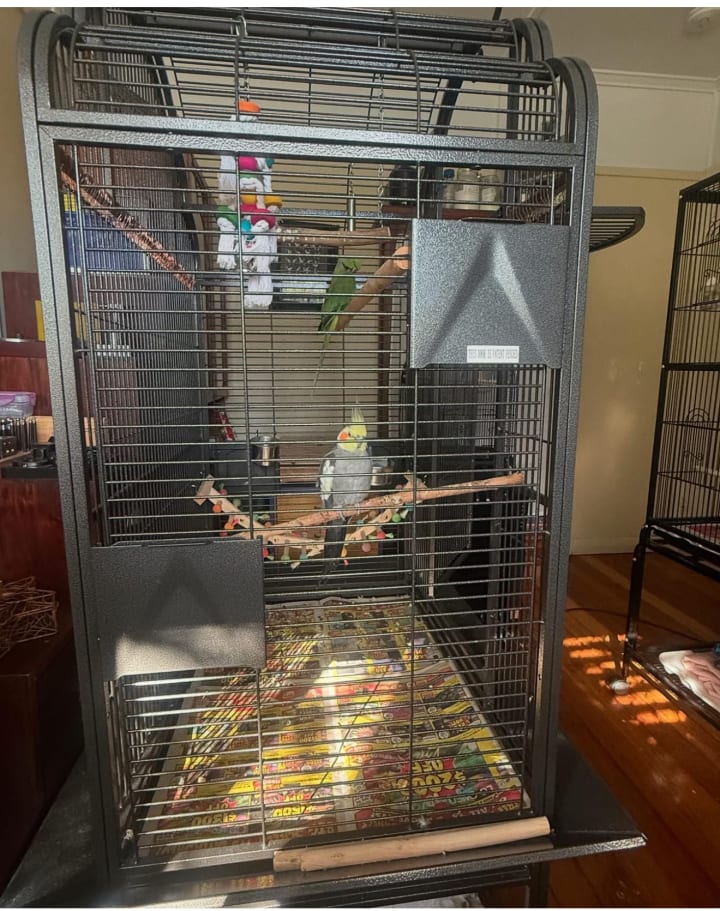 Someone, a very brave cheeky cockatiel named Beau! Is audaciously sharing space with Kermie in his cage! Kermie so far is tolerating this intrusion upon his personal space but I am nervously monitoring the situation. But Beau is as pleased as punch to be flocking wiv da big birds now. (He’s pushing it….) hahaha