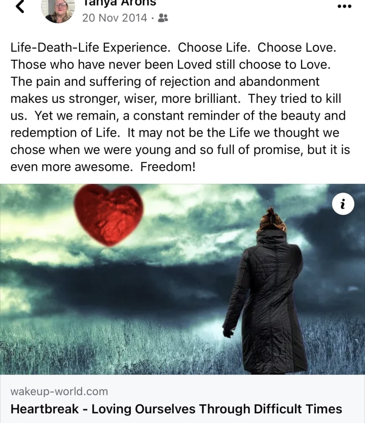 Don’t ever Fuck with The Tanya. It took 59 1/2 years to heal and grow Me back. Almost 60 next April which will be 5 cycles of 12! The metamorphosis as I enter my 60th year has been transformative and astonishing. Btw my child sexual abuse began when I was 6!