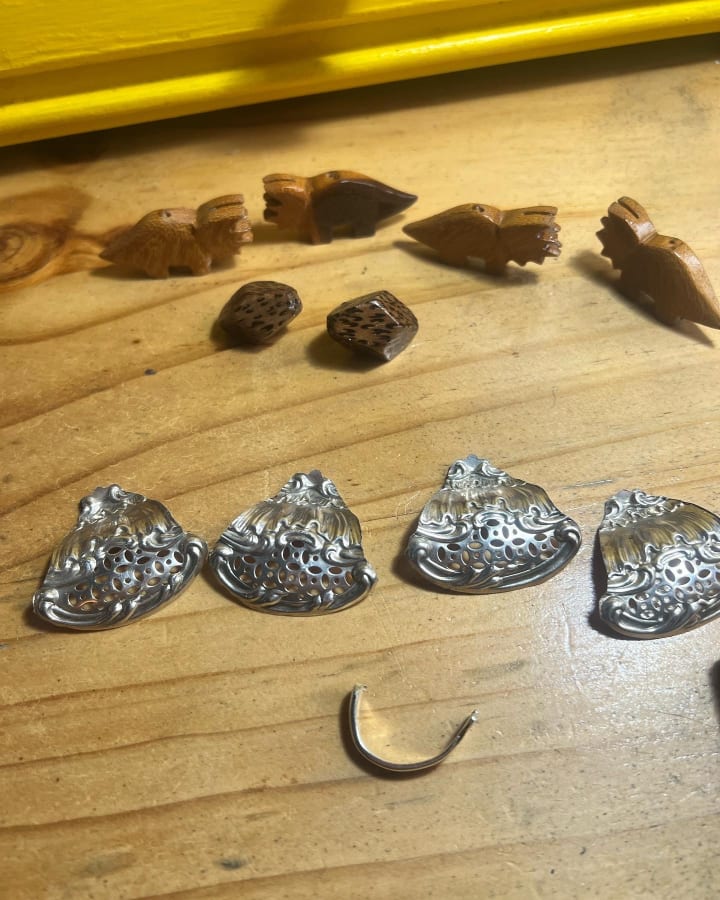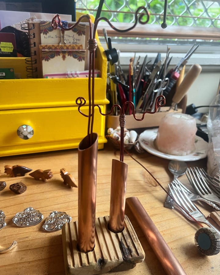 I also sawed a small sterling silver bowl to make earrings from the silver shapes. Then I made earring holders for my wooden and copper tubing display piece.