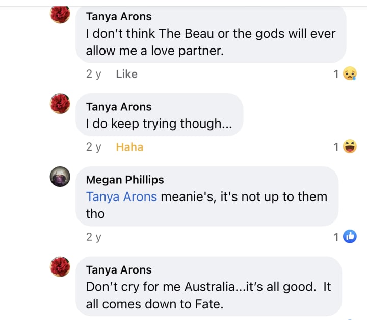 I thanked him and asked what his Medicine Man advised him to do with me. He laughed and said that he had told him about my life history of having difficulties in love relationships, that I am the Queen of the Unrequited, that I have had very soul destroying dangerous relationships with 4 psychopaths, and that I was determined to find love again but very afraid of making more poor choices.