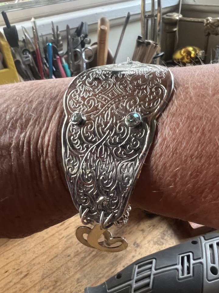 I showed Crystal the jewellery I made in recent days and she suggested I make another snake bangle. I am not sure I can bend it as the spoon handle is thick silver which is why I cut the spoon bowl off the other one I made but I might give it another try with the second spoon.