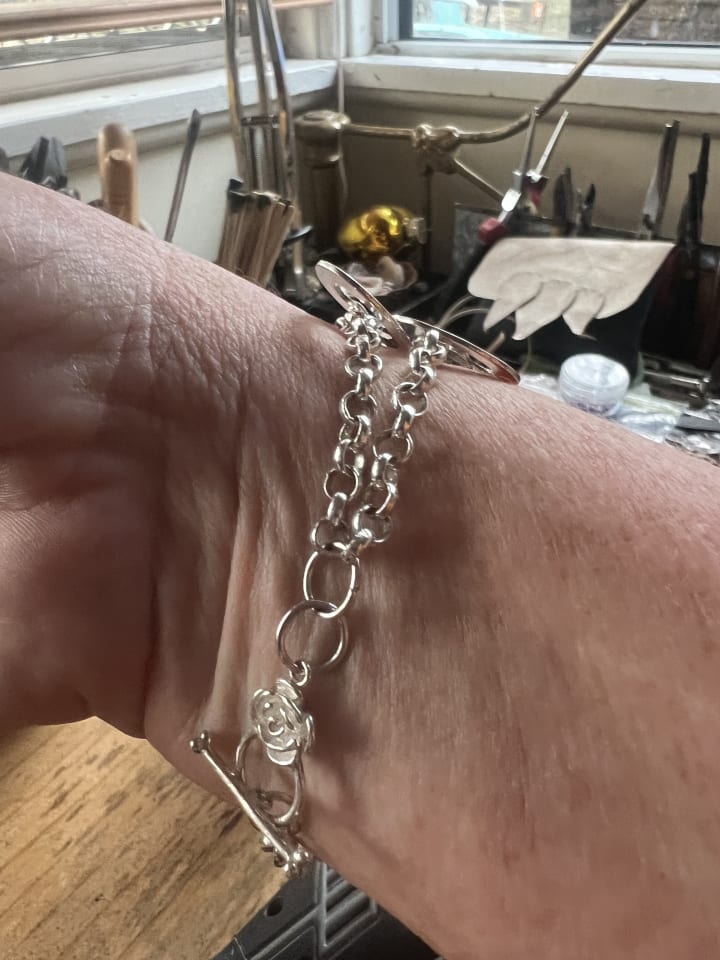 So after receiving his hope-inspiring news that I may have more Time on this planet (if it’s not too far gone or too late!) I set to work this afternoon soldering each jumpring on this bracelet I made about two years ago. I also polished it up.