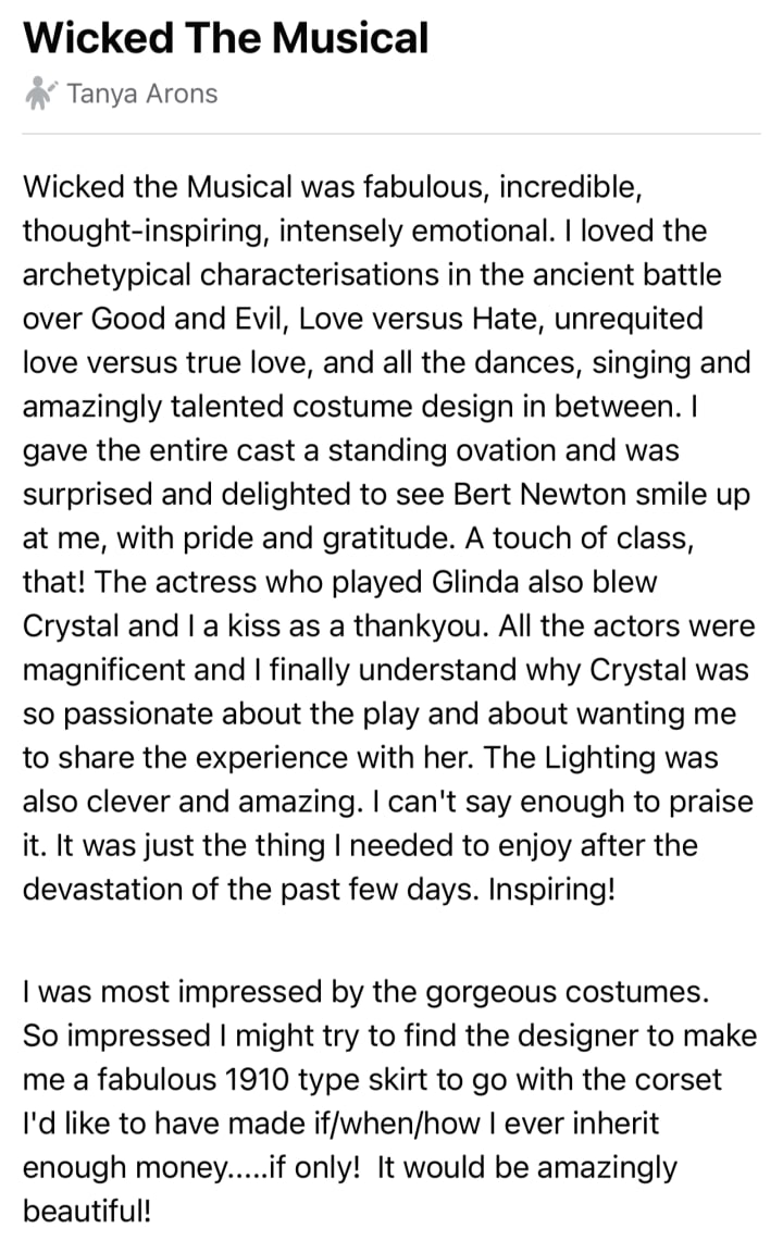 Paris: she went to see the cemetery where Oscar Wilde is buried. Sang him a song from her show and thanked his spirit for his support.