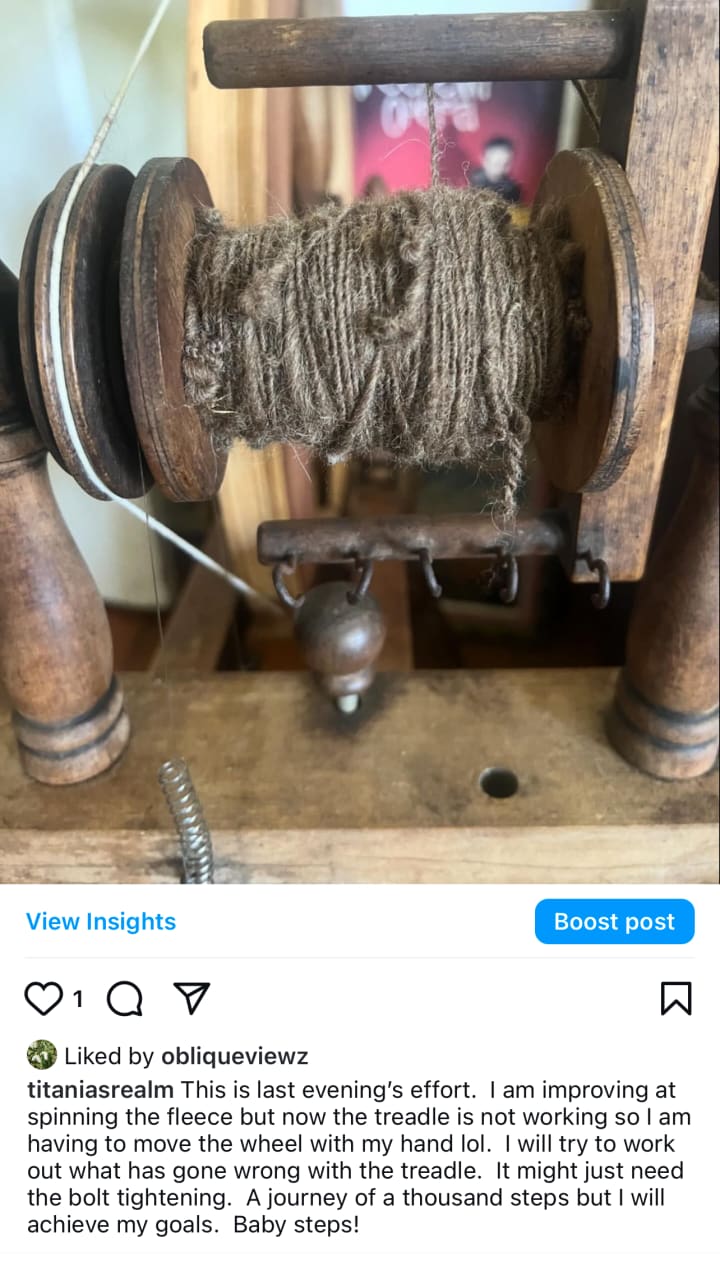 Then I came home and worked on my spinning wheel. I am getting better at spinning but the treadle won’t work so I need to figure out what has gone wrong. I put some more 3 in one oil but it still wouldn’t work properly. Oh well…baby steps.