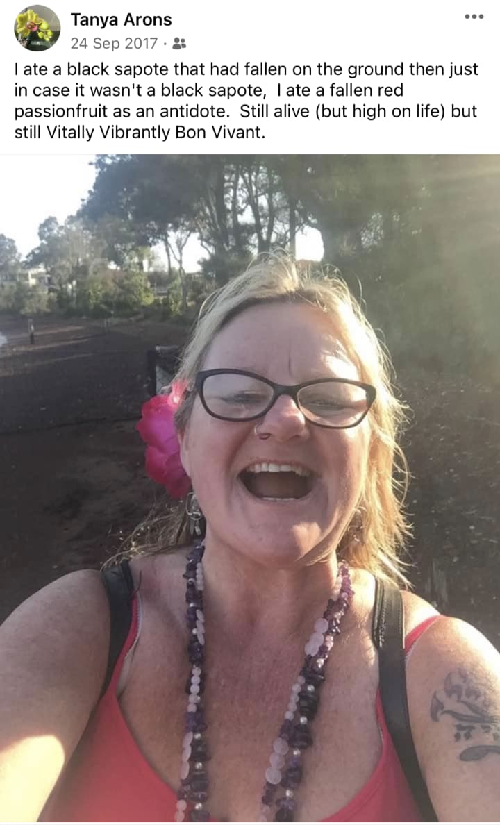 I ate a black sapote that had fallen on the ground then just in case it wasn't a black sapote, I ate a fallen red passionfruit as an antidote. Still alive (but high on life) but still Vitally Vibrantly Bon Vivant.