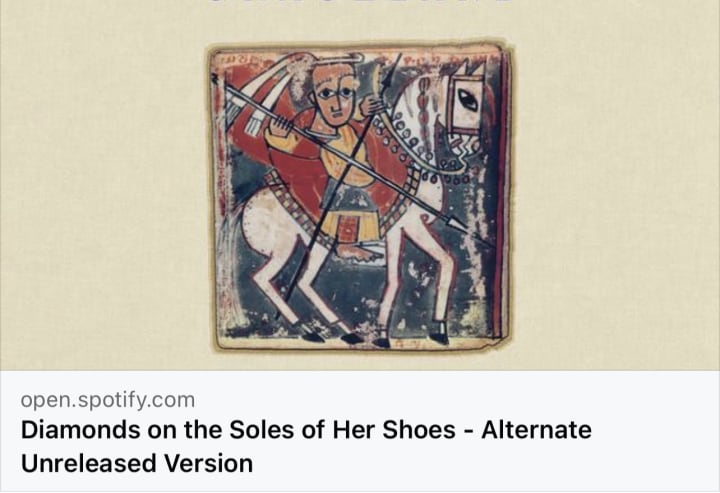 Diamonds on the soles of my shoes (I live on Diamond Street). “She makes the sign of a teaspoon” … I make rings out of silver teaspoons and all my lovers just “make the sign of the wave” …goodbye! Lmao