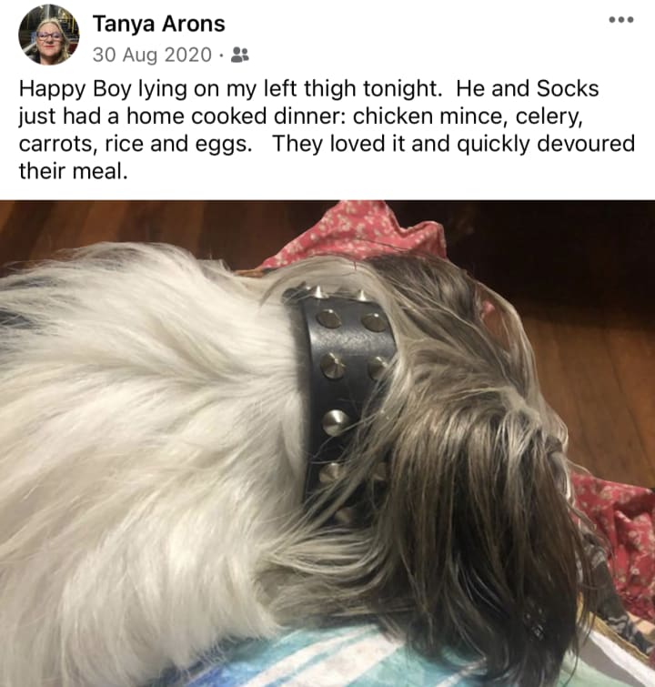 I smile at him. “What the fuck, Kookie? Is this how you gift me back for your treats?” He smiles back, studiously whacking more chicken in all four directions. Happy boy!