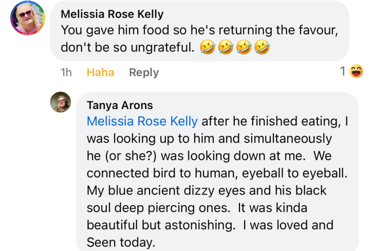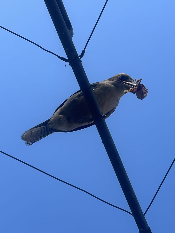 So I gave this kookaburra some left over scraps of chicken. I am sitting on the ground, grounding as I feel so dizzy! I feel little bits of food being dropped on my head. (Cleanly washed hair, in preparation for the wild dance tonight!)