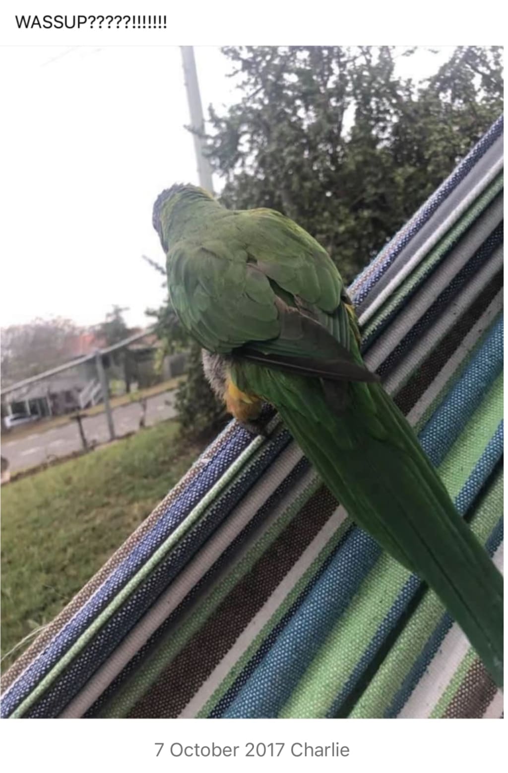I was bemused and delighted this afternoon when Charley had a visit from the wild male rainbow lorikeet and he was trying to seduce her with his courtship ritual. She actively avoided all his advances. It was hilarious.
