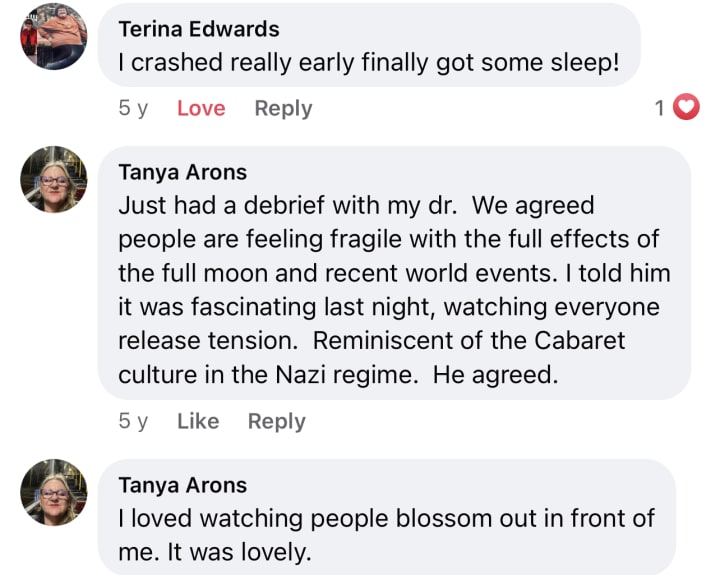 I reached out and simultaneously danced with Glen on my left side and Stef on my right and we all were so joyous and content. When the song ended Glen said to me "Thanks Tanya. That was the best dance of the night". I could see he was happy that I included him and was kind and affectionate.