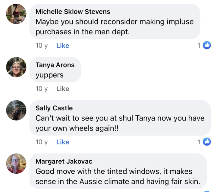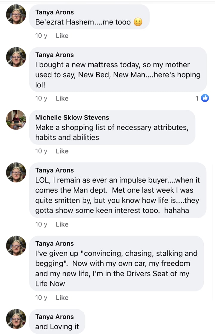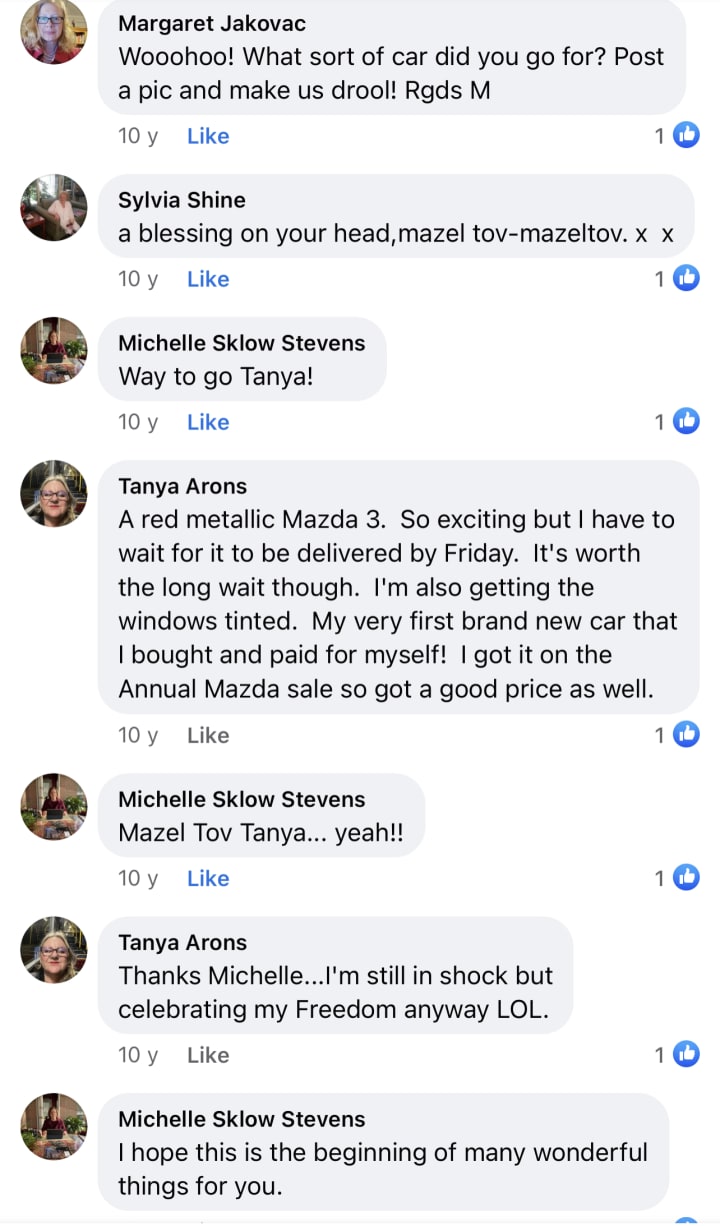 Thank you Hashem! Your miraculous Timing was Perfection and I dared to doubt you! It was an awfully long and debilitating Ordeal but now I have a car and that is the Best Revenge to my former family! The thing they tried to Destroy inside of me... My Freedom and my Authentic Self is back. Awesome!