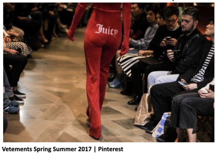 The revival started when Juicy Couture, a pioneer of athleisure and a status symbol in the early aughts (2000-2009) made their Couture fashion week debut in 2017, partnering with Vetements on velour tracksuit sets with the iconic rhinestone “Juicy” embellished on them.