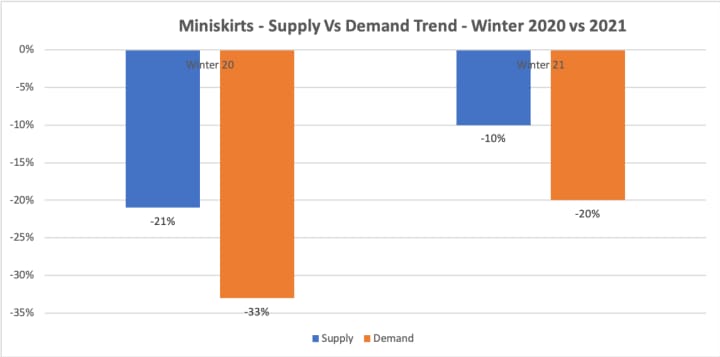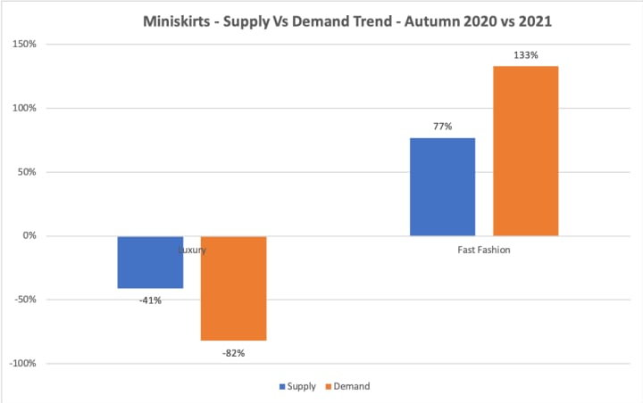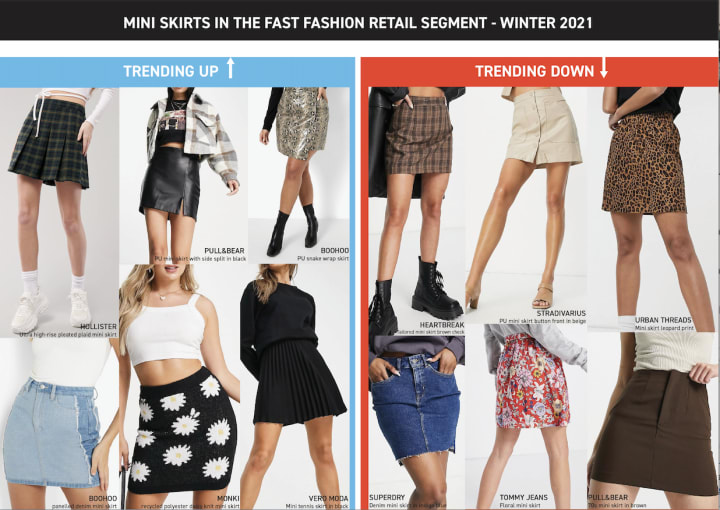 We looked at the trend of a micro category “Mini Skirts” over autumn and winter across the years 2020 and 2021 across USA, UK & EU markets in two segments Luxury & Fast Fashion.