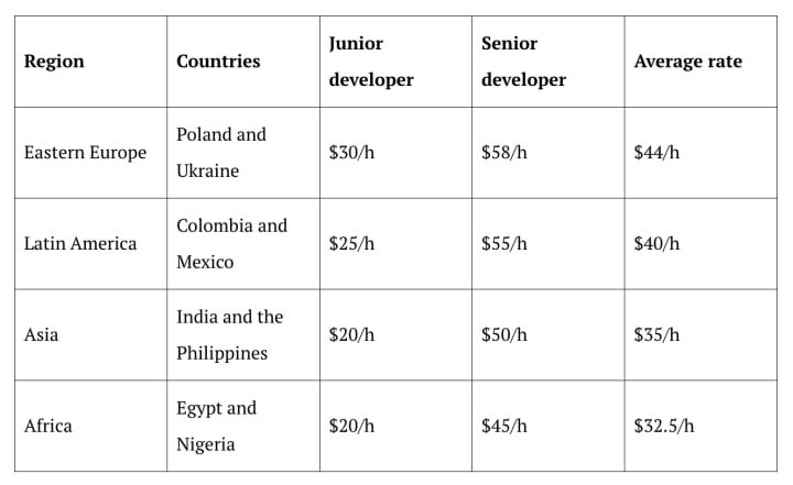 The table below shows the hourly rates software developers command in popular offshoring destinations, including India, Poland, Colombia, and Egypt.
