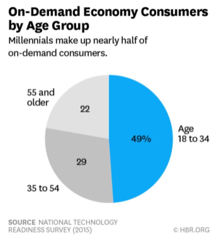 According to research, the value of on-demand services is improving dramatically in recent years. More than 24.9 million customers in 2016 leverage on-demand service while this number is increasing continuously with each passing year. More than 46% of on-demand consumers who leverage on-demand services belong to the age group of 18 to 34. Hence it would be wrong if it is said that more number of the young generation prefer on-demand business services.