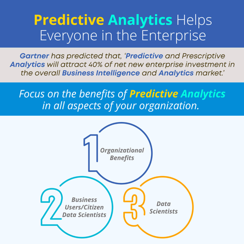 Gartner has predicted that, ‘predictive and prescriptive analytics will attract 40% of net new enterprise investment in the overall business intelligence and analytics market.’ Why the focus on predictive analytics? It’s simple! Investment in predictive analytics benefits everyone in the organization, including business users and team members, data scientists and the organization in general.