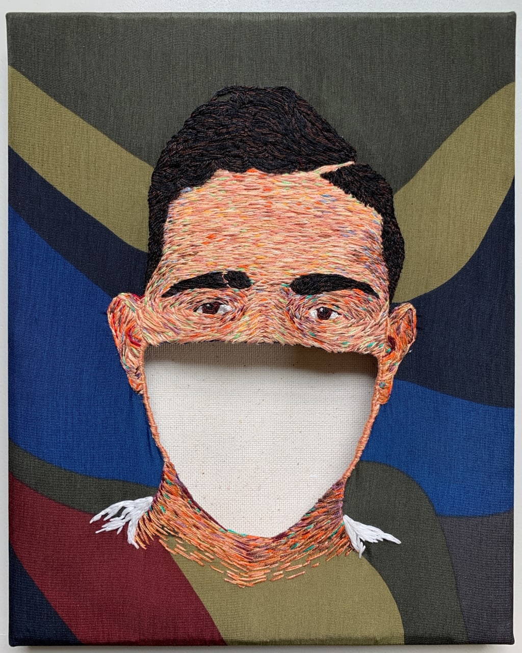 During those three months I worked on a risky, experimental piece. I embroidered a face but the area from the nose to the chin—the area normally covered by a pandemic-style face mask—was (carefully, so very carefully) cut away. The portrait was then mounted on a backward canvas so that a cavity was made in the art. When you looked at the face, you could see through it to the canvas underneath.