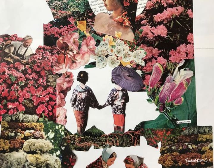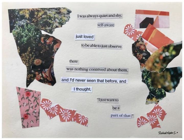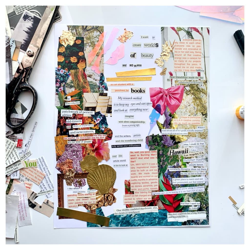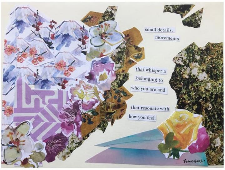 Fingering through the pages of magazines and leaflets, scanning excerpts of articles and features for language and phrases that resonate, scavenging for beautiful photographs or patterns that stir something within, and grabbing that definitive pair of metal scissors to make those key selections are individual acts both calming and meditative, centering and inherently mindful. They beckon me to stay in the present, to experience the here and now through heightened senses, renewed vision, and distilled emotion.