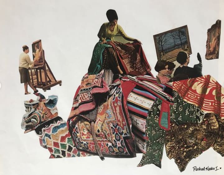 I believe this natural draw to creating collages through imagination and intuition began as a child. My mother, a playful and self-proclaimed “wacky” grade school teacher, first introduced, taught, and encouraged me to collage through her various classroom crafts and projects. Bringing home primary-colored construction paper and brown kraft paper grocery bags, she’d cut circles and squares of reds and yellows, greens and blues, and then slice large holes and slits into the grocery bags’ bottoms and sides. My older sister and I would use our child-sized scissors and a thick white paste to cut and glue a mosaic of colored shapes onto the paper bags, proudly wearing our upside-down bags as paper vests.