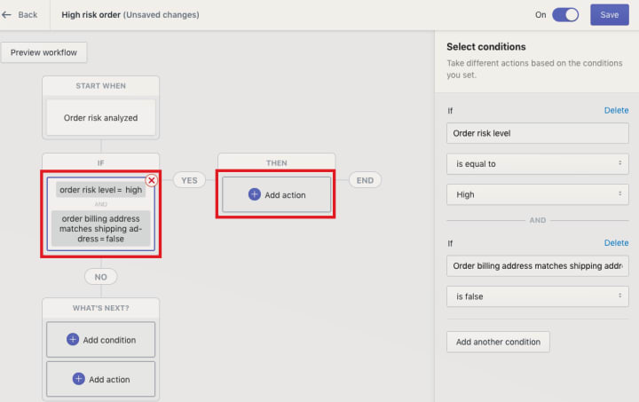 You may use Shopify Flow to send warnings when high-risk orders are placed, making them simpler to examine or to establish an action to reject orders that appear to be fraudulent.
