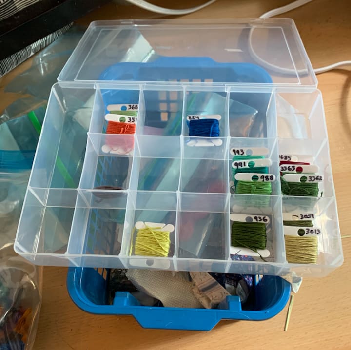 I bought cases and bobbins and turned my giant, disorganized bags o’ floss into this: