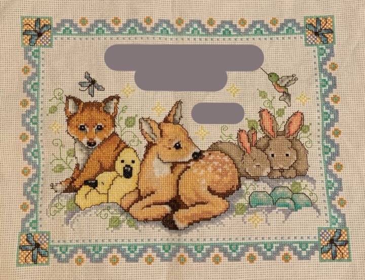 Her second son was born a year ago, and since I had a bunch of time on my hands I wanted to make him a cross stitch to celebrate his birth. Foxes are my favourite animal, so I picked a pattern with a fox in it—that way I’m always watching over him.
