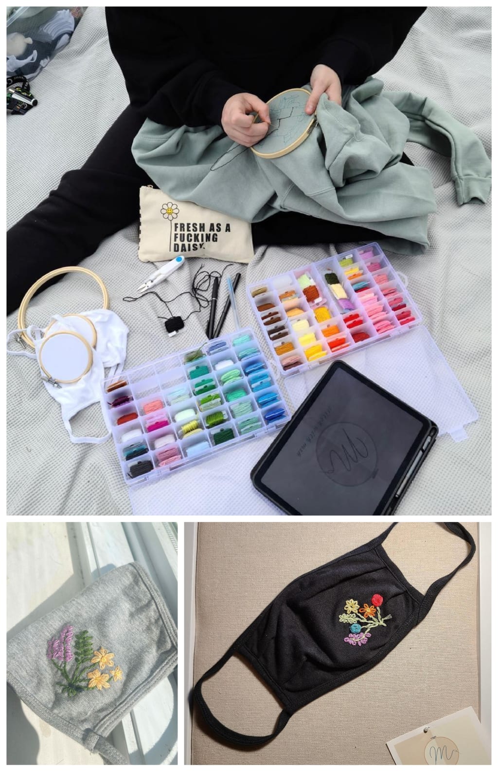 I bought a little embroidery kit off of Amazon and when it came in and I got everything together and started embroidering on random pieces of fabric I started to fall in love with passing that needle through the fabric all over again so I began to step up my game a little and I started to find designs on Pinterest that I wanted and I embroidered my very own mask and that is still the mask I wear today, it's my favorite one. Because I found so much peace with doing embroidery I started a little business called Stitch with Mik and I started making hats and masks and socks and I will be continuing to create more and more.