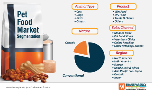 Pet Food Market: Introduction A recent study published by Transparency Market Research on the pet food market includes global industry analysis and opportunity assessment for 2019-2029. Revenue generated from the global pet food market is estimated to be valued at ~US$ 97 Bn in 2019 and is projected to expand at a CAGR of ~6%, to reach US$ 168.3 Bn by 2029.