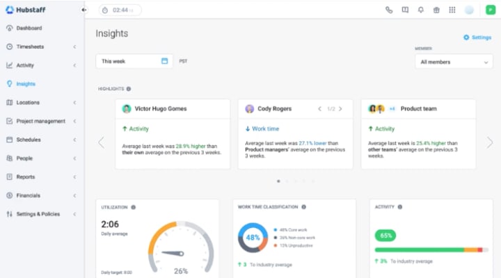 - Workforce analytics (Hubstaff Insights). Get a deeper look into productivity patterns. Spot unusual activity, see utilization rates, and balance focus vs. meeting time across your team. Try Insights for utilization rates, balancing meeting and focus time, spotting suspicious activity, and more.