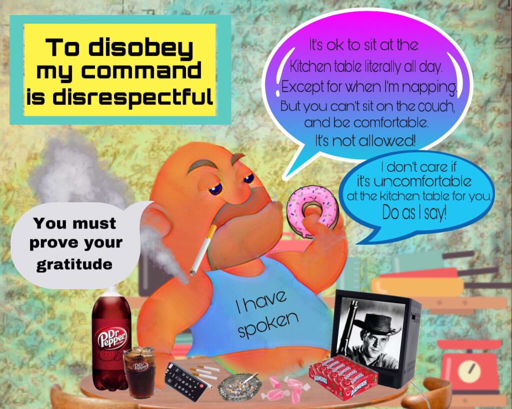 The reason for this specific Jim story is because of what transpired this past week. I had a heart attack on Memorial Day. Due to extenuating circumstances, I found myself staying with Jim. I had tried that in the past when I was looking for housing when I moved back from Texas. It ended badly then, and it ended badly this time for pretty much the same reason as last time. Me being on the couch instead of holding court with him at the kitchen table, adoringly hanging onto his every word, being submissively obedient. You would think after thirty years of conversation, he wouldn’t feel so overwhelmingly ignored if we just did what other “couples” did. I could never comprehend why he felt it was so necessary for us to be in the same room…as long as that room was the kitchen.When we were younger and still together, I barely had time in the evening to watch TV with him. I was busy trying to take care of my son, and attend to all the household chores. He didn’t care if I was in the same room with him, as long as he got a hot meal, fresh laundry, and a clean house, he was happy. If he made noises about me watching TV with him, all I had to do was ask him for some help, and he shut up. But as he got older, and we parted ways, he became psychotically needy.You see, Jim is a kitchen chair potato, not unlike a couch potato. He used to be the typical couch potato, but the older he got, the less comfortable it was for him. So he gravitated to the kitchen table, and there he will sit until the day he dies. The difference is, in his illogical logical reasoning, he is somehow less “lazy”. Mind you he has all the trappings of a couch potato. He has his TV on the table, which is always on, his cigarettes, his snacks, his newspaper, and anything else he desires within arms reach. But because he is in an upright position, even though he’s laid out in his chair like a beached whale, rolls of beefy flesh hanging off his body like a fat cow, he still thinks he’s living a healthy lifestyle, as compared to a couch potato. Since he doesn’t work, he literally sits at the kitchen table all day long, except for when he excuses himself to his bedroom for his usual midday nap. From sun up, to sunset, you will find him at the kitchen table, smoking one cigarette after another, eating junk, and continually mesmerized by whatever mindless program he is watching. If I happen to be relaxing on the couch, he will loudly squeel in delight about something he’s watching. He’s hoping to bait me into the kitchen, to lure me like a hapless fish. I realize he’s lonely, but it is of his own doing. He has no friends, and no interest in socializing. He blames everybody else for his uneventful life, his boring existence. He is Lord of the kitchen table, it is his little kingdom where he either approves or disapproves of his captive audience’s behavior. And I do mean captive audience, because if I don’t come into the kitchen to sit at the table with him, if he sees me on the couch for what he deems too long, he will bully me, chastise me, condemn me, and tell me how ungrateful I am, and just be an asshole in general. I just keep waiting for him to declare “off with her head” like the vengeful queen in Alice in Wonderland. He will complain about the way I lay on the couch, or lean against the armrest, as if those are somehow unacceptable positions, even though in the rare times he does relax on the couch, he leans against the arm rest with aristocratic pomp, his legs spread across the cushions.