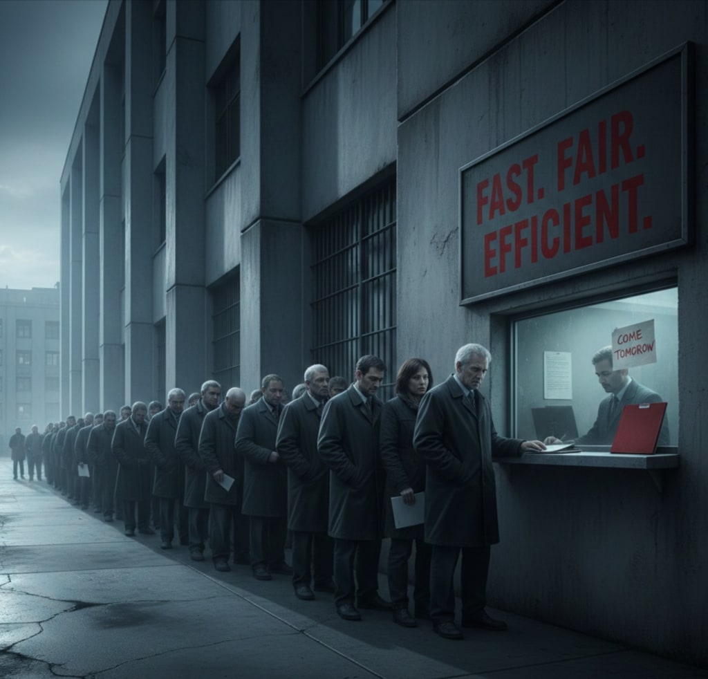 A story about a system that promises efficiency but survives on delay, silence, and quiet compromise.