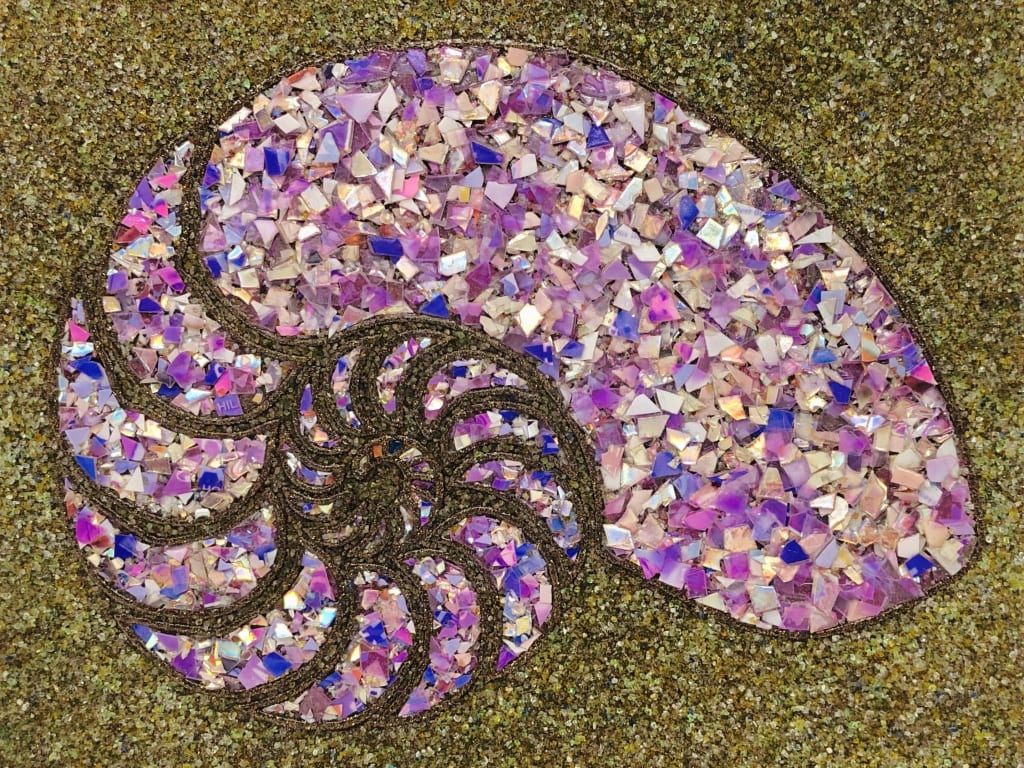 My favorite resources to use are retired media discs, like CDs, DVDs, the plastic, jewel cases that holds the CDs, laser discs, and vinyl records, as well as single-use plastic, glass and paper packaging. Using multiple tools and mostly unconventional or made up techniques, I cut, heat, paint and transform trash into what I hope are inspirational works of art that will last for generations to come. Since what I do is not really taught, I create my own or tweak traditional processes and learn most of my techniques on the fly using what I have on hand. I take walks in nature and often find interesting dried plants, rocks or other natural resources that I like to use as stencils or stamps in my art. I am not a traditional artist or painter by any stretch of the imagination. I adore whimsy and wit, but also try to strike a balance with an underlying statement about our wastefulness as a society and need to protect our environment. My art often depicts what I see in nature combined with my own imagination. For example, a recent piece titled, “Seanicorn,” is a sculptural wall hanging depicting a whimsical sea horse with a unicorn horn. Another example is a mosaic piece titled, “Nautilus”, which uses pieces of CDs and DVDs to form the image of a nautilus shell. Nature is always at the heart of my art.