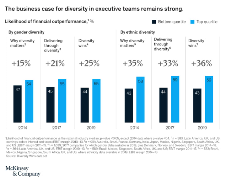 According to McKinsey & Company’s 2019 analysis, gender-diverse companies—particularly among executives—were 25% more likely to have above-average profitability than their competition. Similarly, ethnically- and culturally-diverse companies outperform their competition by 36% in profitability. In other words, diversity brings concrete economic benefits to an organization, helping them increase productivity and professional drive through greater communication and understanding. Moreover, the table below demonstrates that the economic benefits of diversity have increased over time, suggesting the organizational value of diversity will continue to grow.