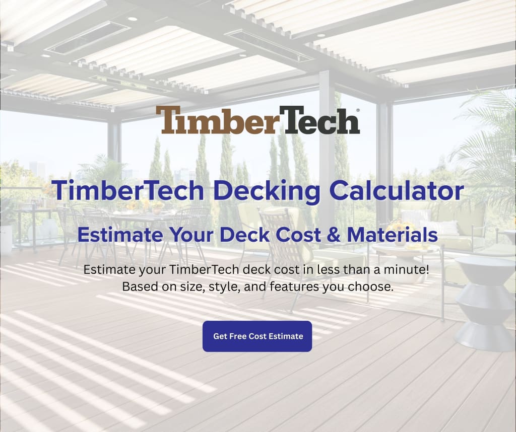 The TimberTech Decking Calculator is a free online tool that helps you estimate both cost and materials for your deck project. It’s simple to use - just enter your deck size, choose a TimberTech collection, and select any add-ons. The calculator instantly gives you: