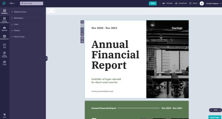 A great fit for presenting annual reports with massive numeric data, marketing research, business plans, etc. which also provides an opportunity to create infographics and animation apart from slide decks.